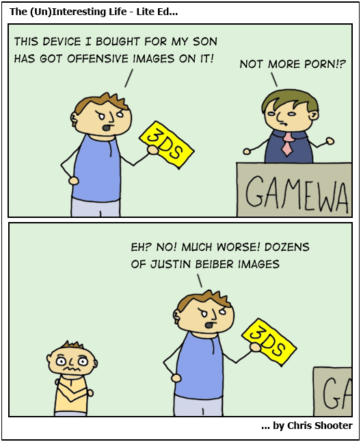Home » The (Un)Interesting Life: Lite Edition – Offensive 3DS The (Un)Interesting Life: Lite Edition – Offensive 3DS Chris Shooter 01/01/2013 You May Also Like Cartoon: The (Un)Interesting Life… 20/08/2012 Cartoon: The (Un)Interesting Life… 13/08/2012 Cartoon: The (Un)Interesting Life…Insomniac Bomb Squad 14/01/2013 Cartoon: The (Un)Interesting Life…Middle Age Spread… 29/01/2013 Cartoon: The (Un)Interesting Life… 10/04/2012 Cartoon: The (Un)Interesting Life… 07/05/2012 5 Comments ShadowAU 01/01/2013, 16:33 Haha, a preowned psp I bought years ago had a memory car with porn still in it. But srlsy….. pictures of Justin B…? thats, sadistic. Reply SolidJackal 01/01/2013, 16:38 What has been seen not be unseen (sorry I had to do it) funny comic btw Reply Chris Shooter 01/01/2013, 18:35 I used to work as a sys/network admin in a private high school years ago and some of the teachers used to bring me their home machines to sort out – jeezo some of the things you used to see… Reply Catfunce 01/01/2013, 20:02 ha nice! huh. so what is that rest of the shop name there? gamewa…? Reply Chris Shooter 04/01/2013, 12:19 heh, in my mind it rhymes with “Anchor”… Reply Leave a Reply Cancel ReplyYour email address will not be published. Required fields are marked *Comment *You may use these HTML tags and attributes: <a href="" title=""> <abbr title=""> <acronym title=""> <b> <blockquote cite=""> <cite> <code> <del datetime=""> <em> <i> <q cite=""> <s> <strike> <strong> Save my name, email, and website in this browser for the next time I comment. Δ