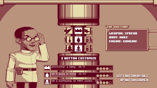 The premise of the game sees you taking control of a ‘Rauser’, a customisable plane made up of three core parts – the engine, body and weapon. You are tasked with taking on the forces of, well, evil, I assume – to be honest, this is never explained to you, but the attire and demeanour of your colleagues suggest you may be on the wrong side! Acting as a lone wolf, you must take on a variety of air- and sea-craft, ranging from bi-planes your own size, to battleships and blimps that take up most of the screen! The longer you stay alive, the more enemies appear – and things go from manageable to insane quickly.