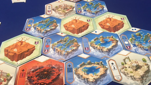 After seeing the game briefly at the Press Preview on a Thursday, I was really excited to have a play through and on a Sunday I finally managed to spot a free demo table. Orbis will immediately appeal to the fans of Century: Spice Road and Splendor. The gameplay shifts from the central market, where players can pick up tiles representing different kinds of lands, and the play area, where they build a pyramid from the tiles they picked up. At the end of the game tiles score depending on their location in the pyramid, the number of tiles of the same type or even straight up victory points. The game was still in its prototype form at the Expo, so not all of the rules have been tightened up yet. In particular, I thought the power that gives an infinite single type of resource made it a bit too easy to buy more tiles. However, even so, Orbis was tones of fun.